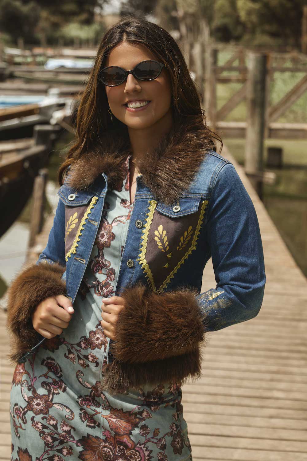Cazadora vaquera customizada con pelo vegano, pasamanería y pintada a mano. Corte ajustado. Denim elástico.