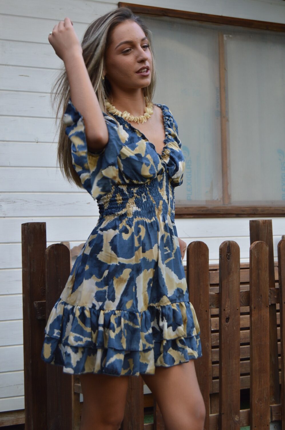 Vestido corto de seda con goma en la cintura y mangas acampanadas.